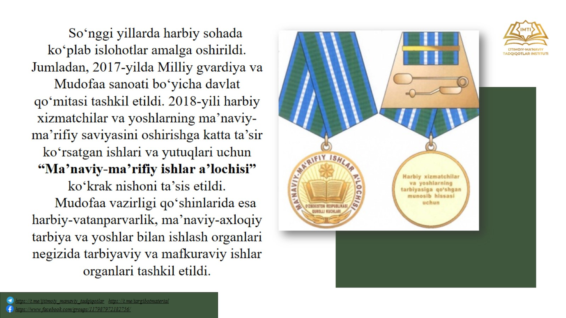 Vatan himoyasi yo'lida jon berganlar xalqning, millatning xotirasida mangu yashaydi! Biz navqiron avlod barkamol, yetuk bo'lib voyaga yetsak, o'zimizda or-nomus, milliy g'ururni izchil shakllantirib borsak, Vatanimiz shunchalik qudratli davlatga aylanadi. Vatanni, xalqimiz tinchligi va osoyishtaligini ishonchli himoya qilish, vatanparvar bo'lish, sodiqlik, fidoyilik tuyg'ularini his etib yashash jannatmakon O'zbekistonimizda yashayotgan har bir insonning sharafli burchidir!